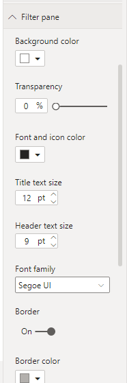 The Filter pane’s background color, fonts, and icons, border configurations of that, all can be configured under this section.