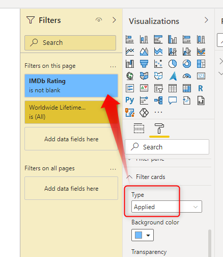 Applied in a filter card with some filter set in it already. For example, the filter for the IMDb rating below is set to something (is not blank), while the filter on Worldwide Lifetime is not (showing all). That will make the IMDb rating filter card, an applied card.