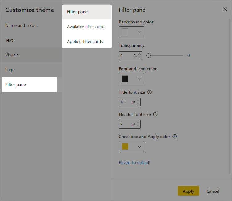 In the customize theme, there is a tab for the Filter pane, and sub-tabs for available and applied filter cards;