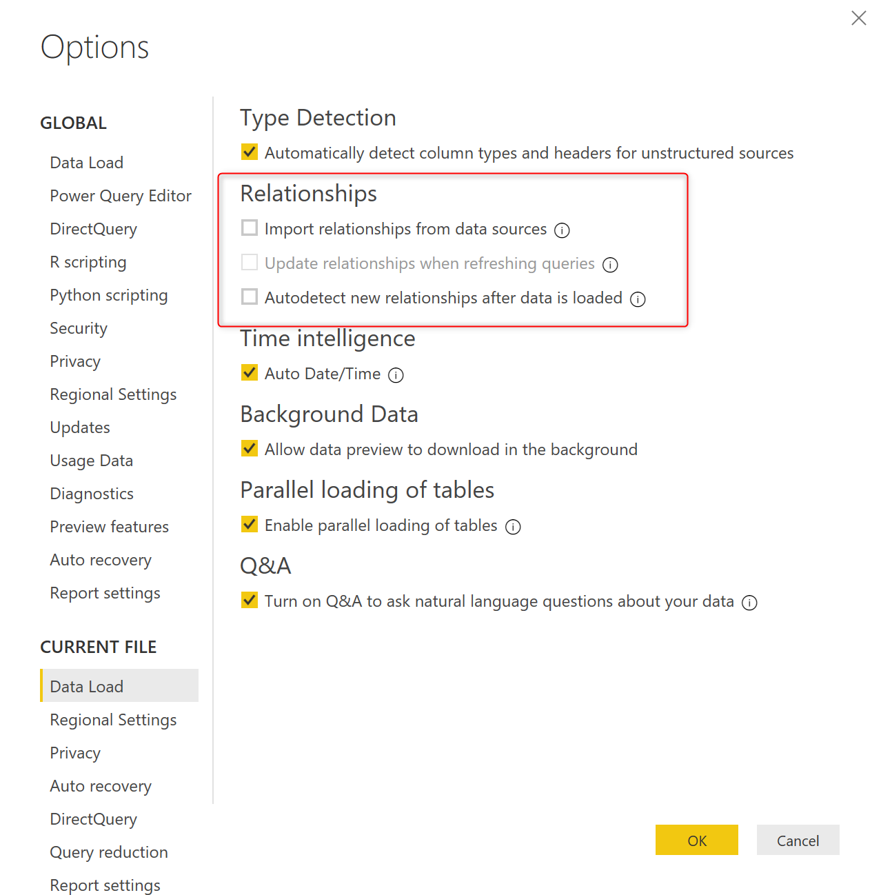 In order to learn relationships, I do recommend you to turn off the auto-detect relationship (I don’t mean always! Just for the purpose of this learning). Having the auto-detect relationship stops you from learning what is happening behind the scene. If you want to turn off this feature, you need to first go to options of Power BI Desktop;