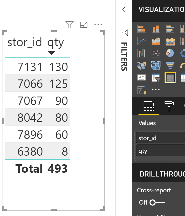 Now, if we want to filter and find out what is the total Qty of book titles sold in each store, we can do that using a visual like below;