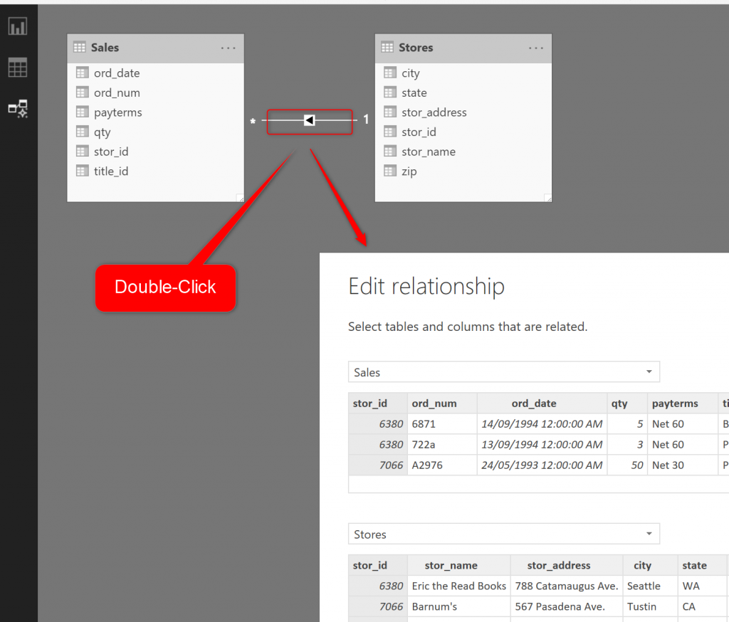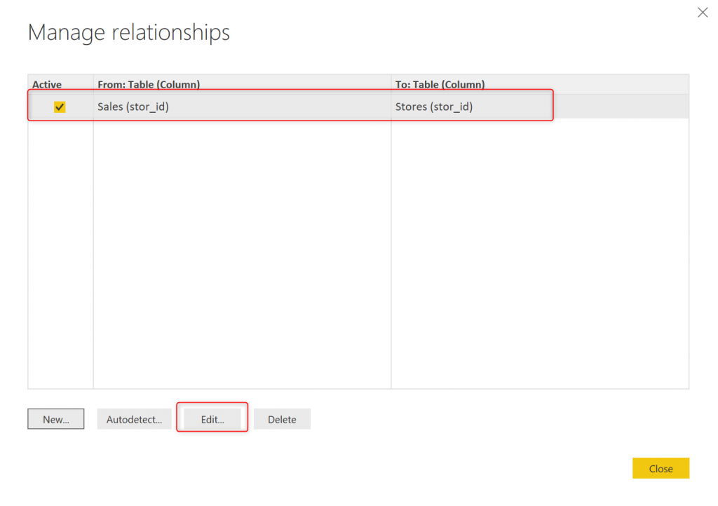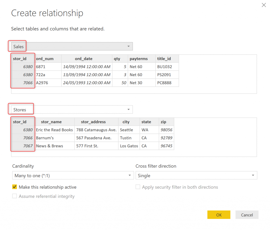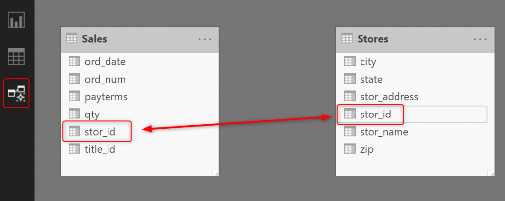 The two fields from the two tables can have the same name or different names. If they have the same name (or let’s say similar name pattern), Power BI can automatically detect that relationship. Remember that we turned off that feature earlier in this article to make the learning process easier. By default, the auto-detect relationship is on and would have detected a scenario like this that we had stor_id in both fields and would have created the relationship.