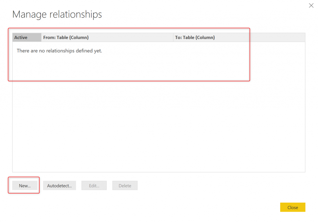 You will see the Manage Relationship window which will show all existing relationships and their “from” and “to” columns. You can create a new one by clicking on the New. You can also notice that there is a “autodetect” option right beside “New”, just in case you want to use.