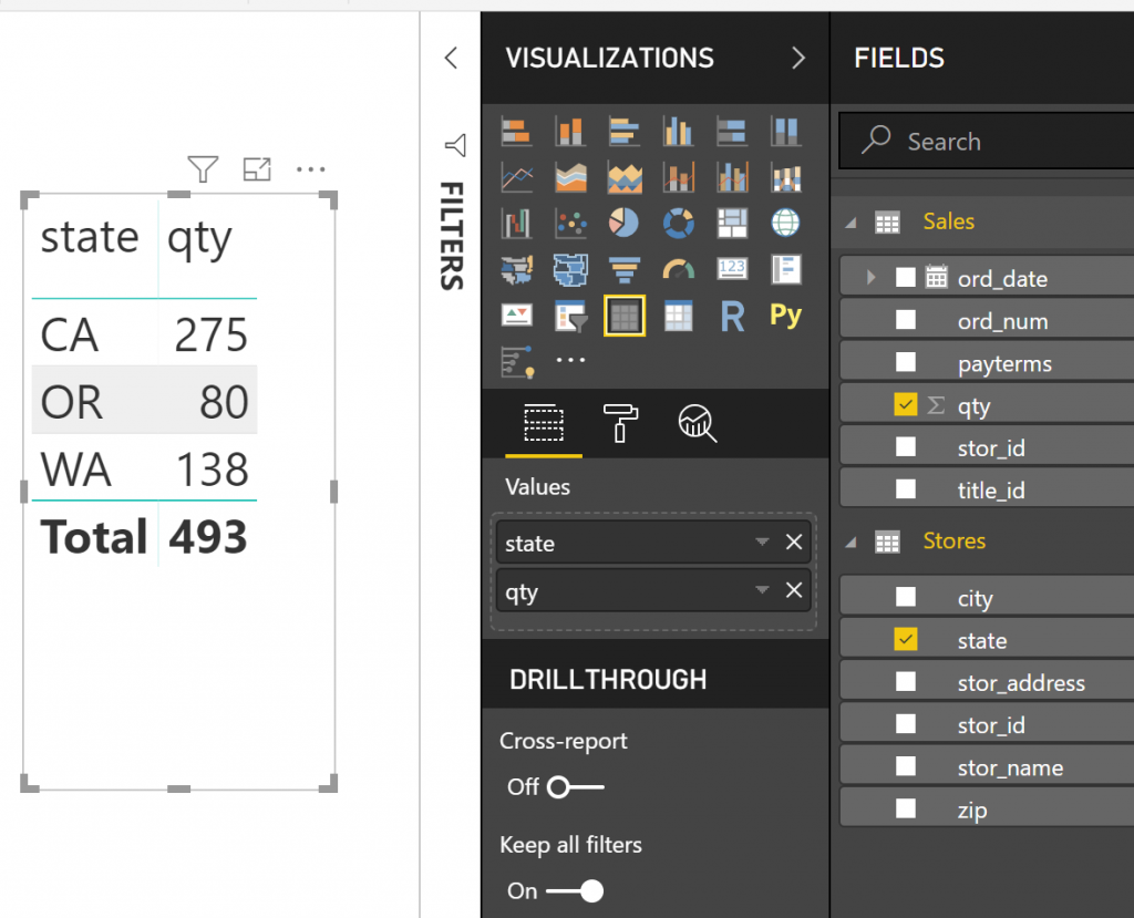 As you can see in the above visualization, the total of qty for each state is 493! And the total qty in the Sales table is also 493! Obviously, this time filtering didn’t happen correctly. Because Sales only knows about the stor_id, not the state: