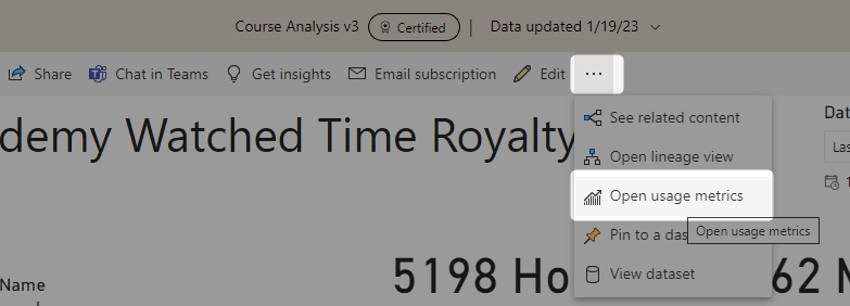 Let’s first explain what the issue is. Each report and dashboard have a usage metrics report, which shows where and when, and by who the content has been used. You can usually find it at the top of the dashboard or report in the Power BI service.