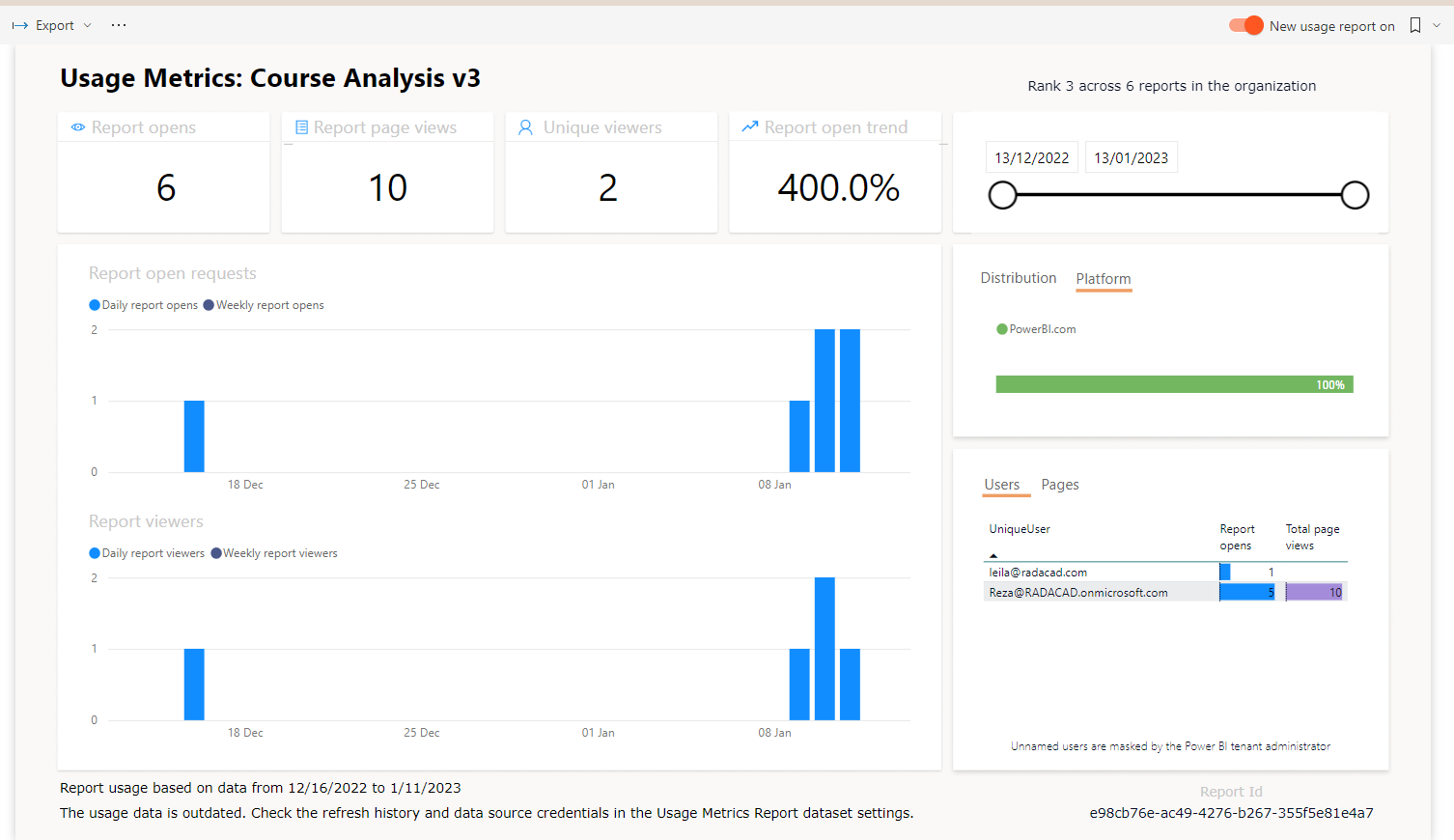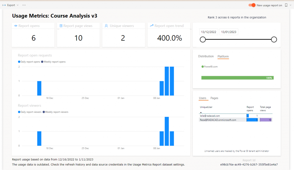 For example for users that have installed PowerBI Application on his mobile, I’m finding recurrent Views of Reports every two hours. I imagine that this is due to the automatic refresh of the mobile application but this is producing wrong data and information about the views of the reports.