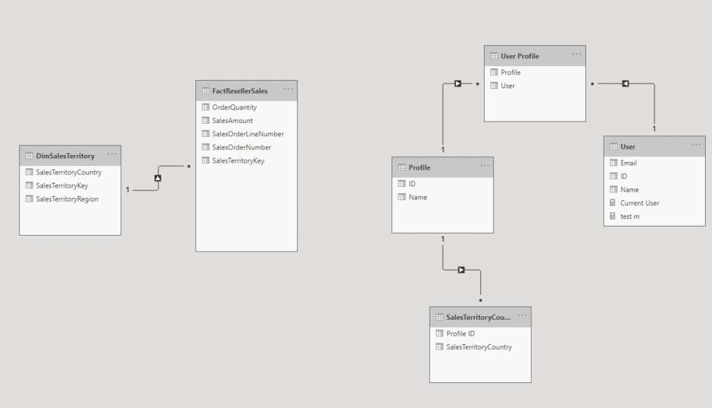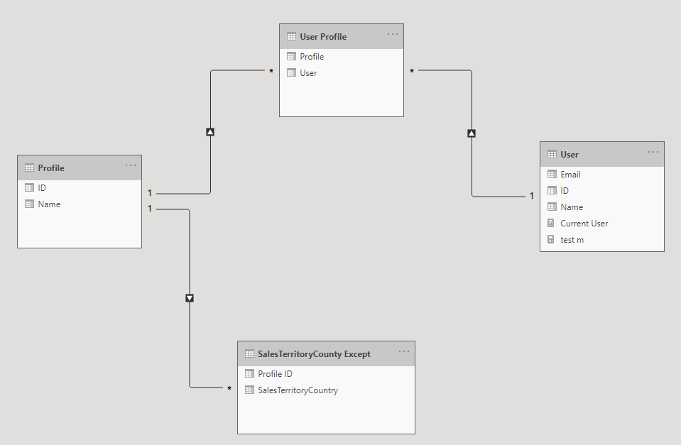 Implementing the Except rule in a dynamic RLS patterns is a bit different than normal situation. Why you may ask? The reason is the behavior of the relationship in Power BI. Relationship in Power BI means filtering, and by creating a relationship between an RLS table and the tables in the sales pattern, we create a way of filtering that says I just want these values to be INCLUDED.