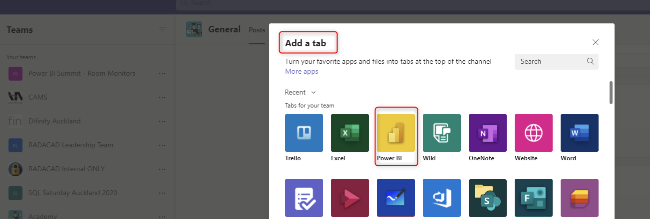 Adding a Power BI tab in Teams