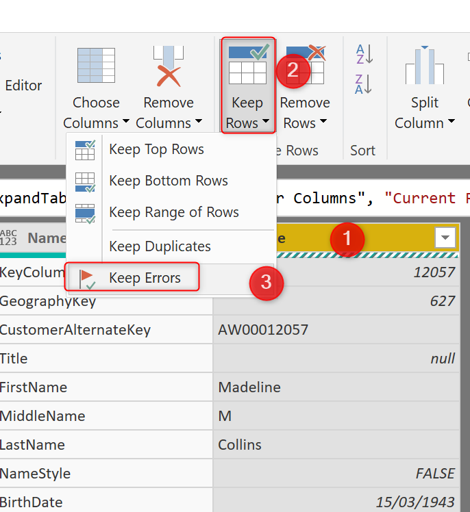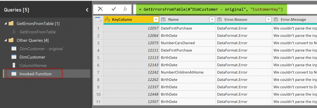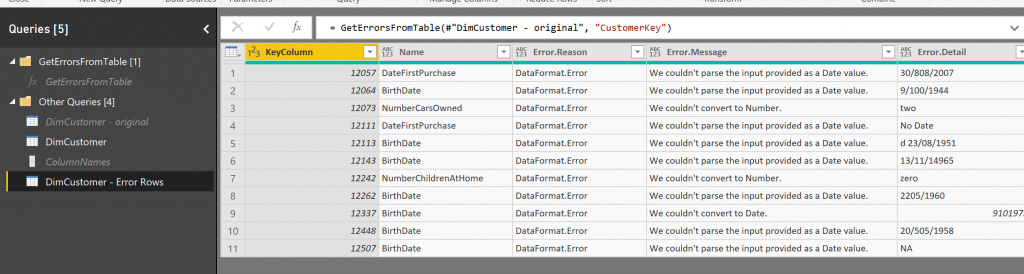 By just calling this function we get all error rows and error columns in the table. This Invoked Function name can now be renamed to DimCustomer – Error Rows.