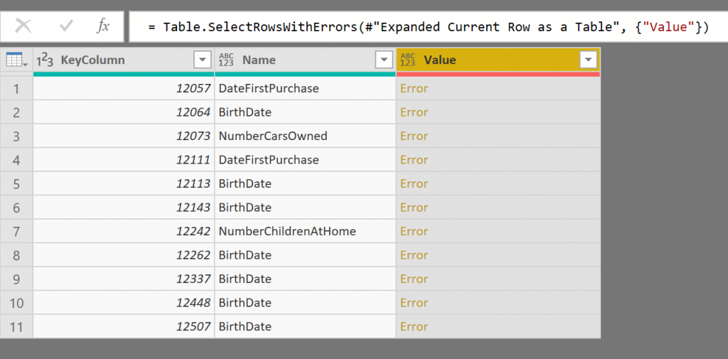 #"Kept Errors1" = Table.SelectRowsWithErrors(#"Expanded Current Row as a Table", {"Value"}),