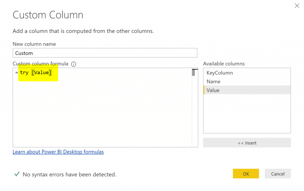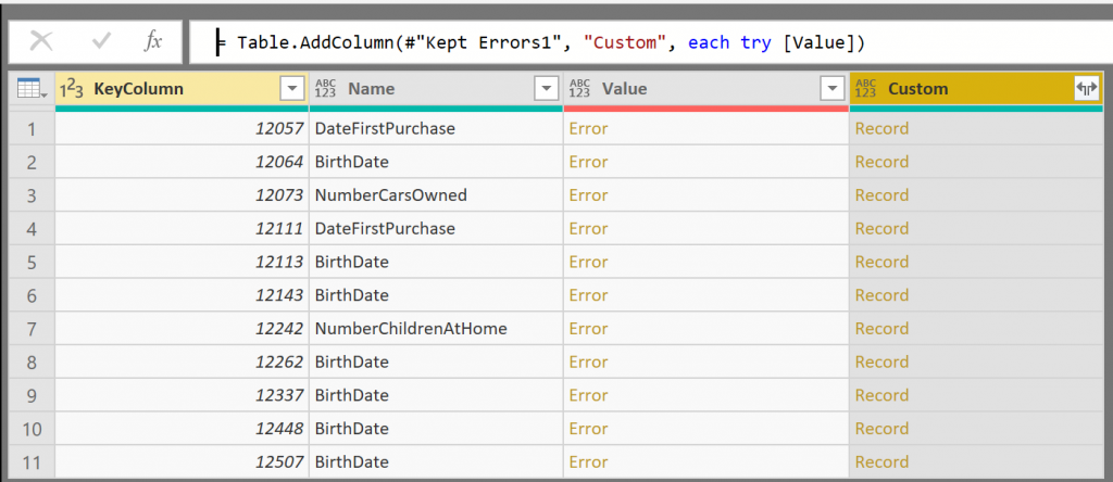 #"Added Custom2" = Table.AddColumn(#"Kept Errors1", "Custom", each try [Value]),