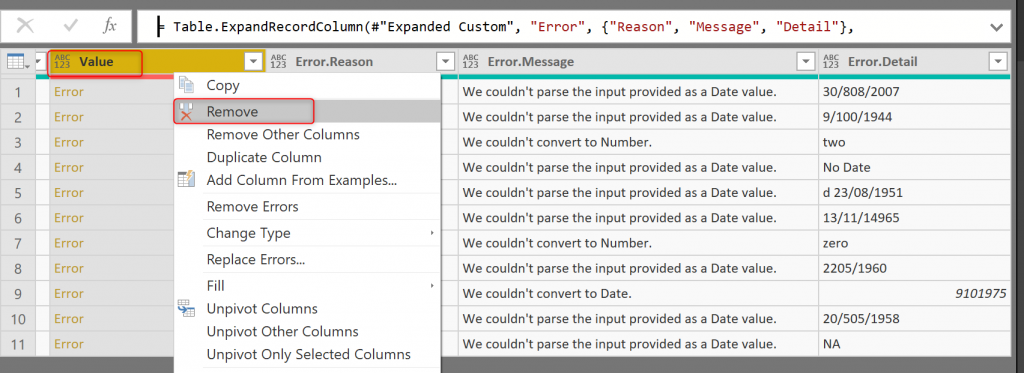 And as the final step, remove the column that has errors in it, which is the Value column. (If you don’t do that step, you will get an error when you load data into Power BI).