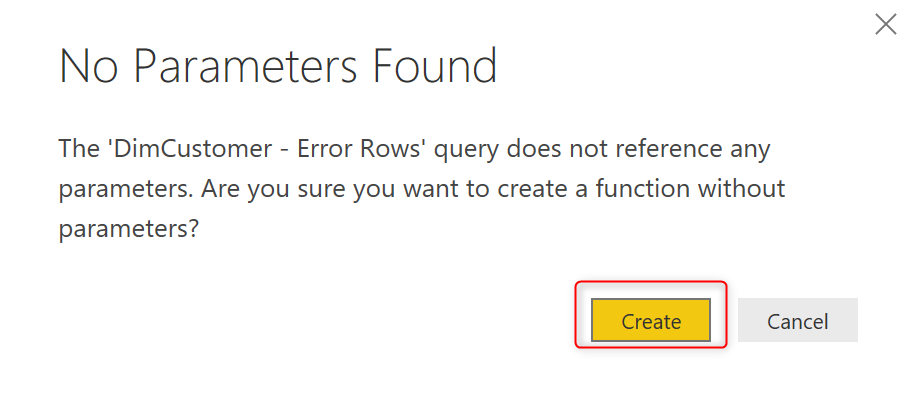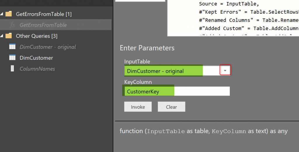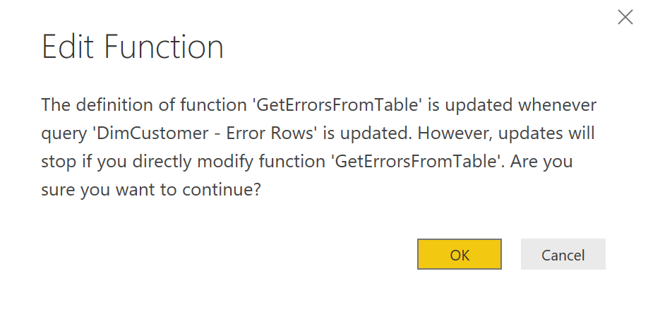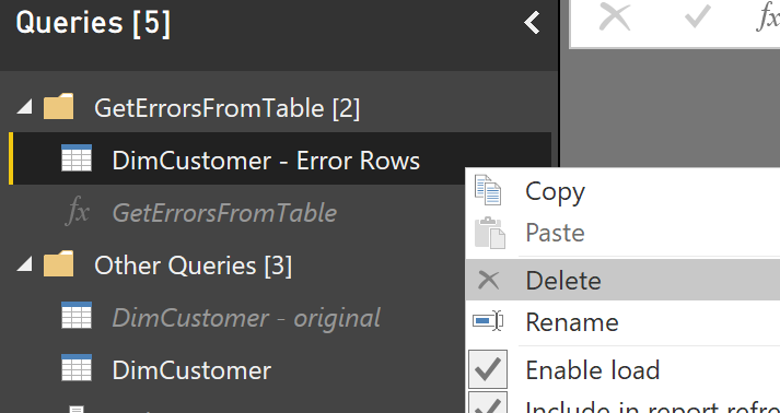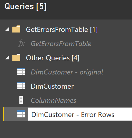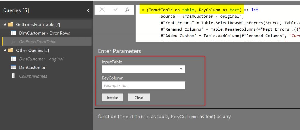 Now that you have created the function, you can easily call it, and get the error output. We won’t need the DimCustomer – Error Rows anymore to be calculated separately. Having that in the solution, means we will have two instances of the same code for detecting the error rows, which cause higher maintenance. Let’s remove DimCustomer – Error Rows;