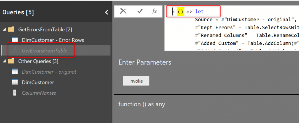 The first step is to create a function from what you did in DimCustomer – Error Rows. Right-click on that table and then create a function;