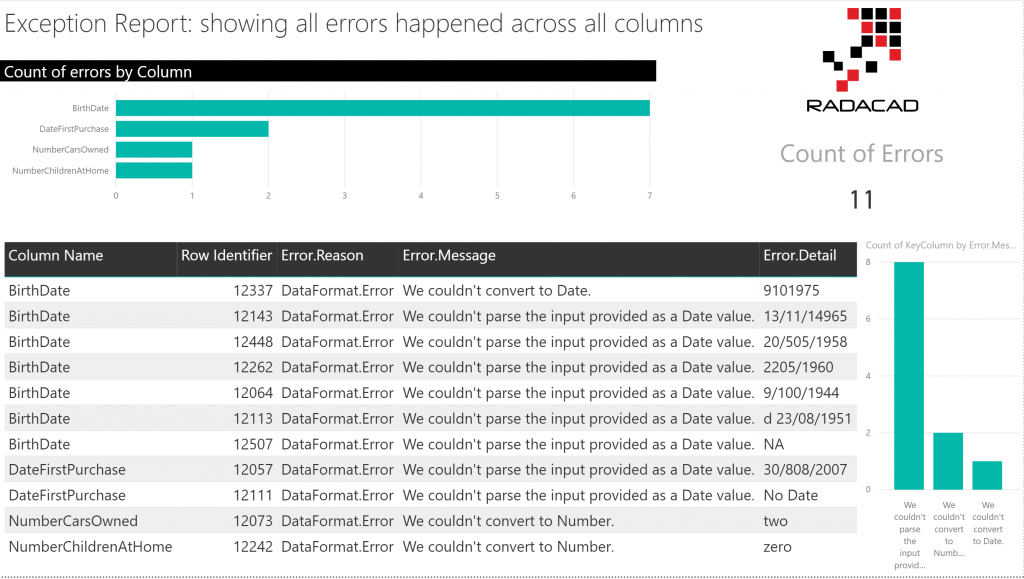 In part 1 of exception reporting(link), you learned about how to do exception reports for one column in your dataset table. In part 2, you learned how you can achieve an exception report even if you don’t know which column causes the error. This new method will search through all rows and all columns that cause the error. The method implemented in this article ended up with a function that you can use for any table to get the error rows output.
