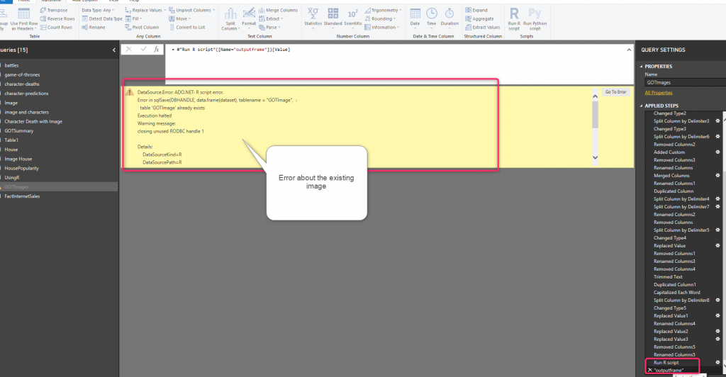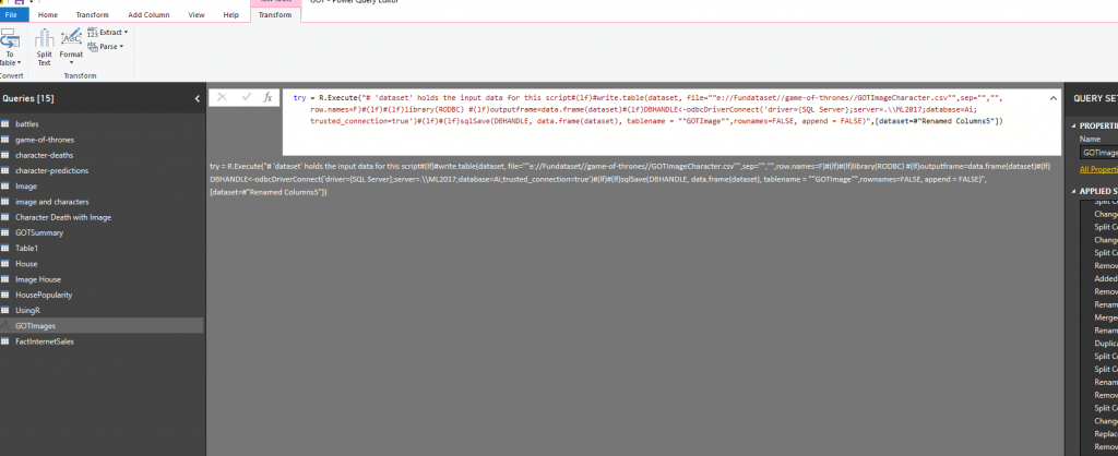 Then in the new R script Editor write the below code, the dataset variable holds all queries,