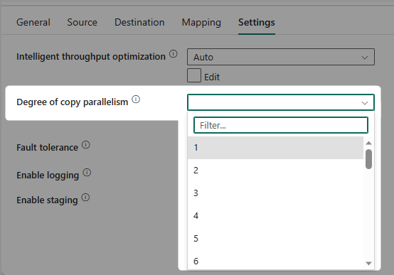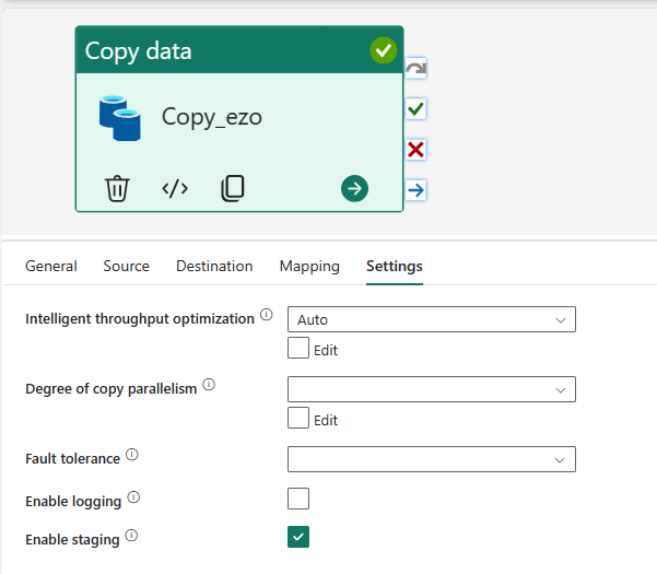 In addition to advanced settings in each tab, you also have a Settings tab, where you can set up things such as parallelism, logging, staging, and a few other options.