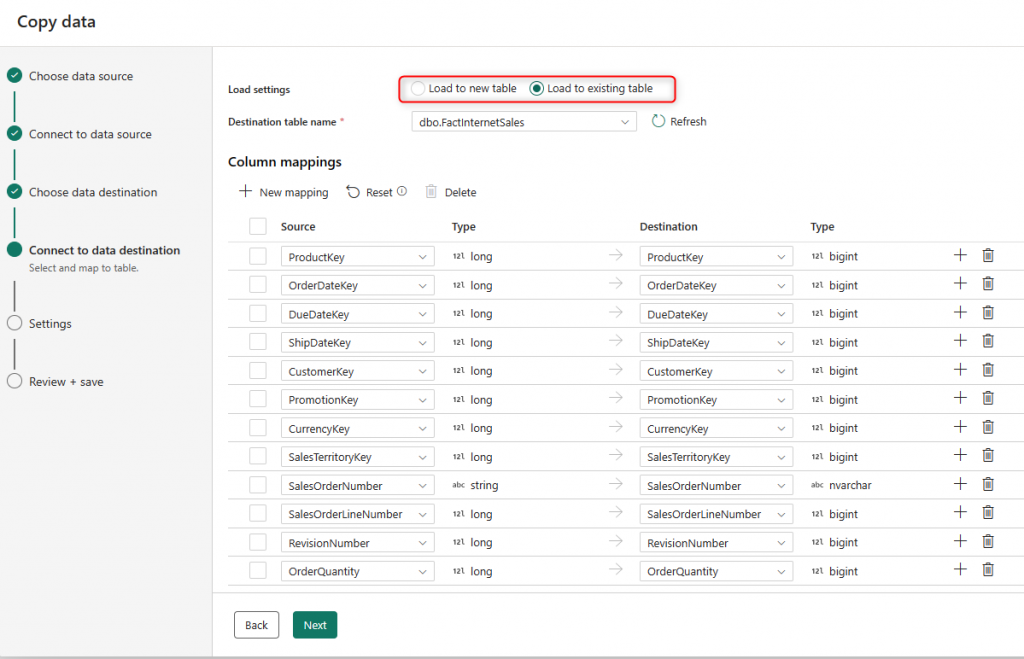 Copy Activity supports many data sources. Once the data is selected from a source, you can choose the destination and the mapping between the source and the destination. That’s it. No transformations. This will be a pure copy but a very high-performant copy.