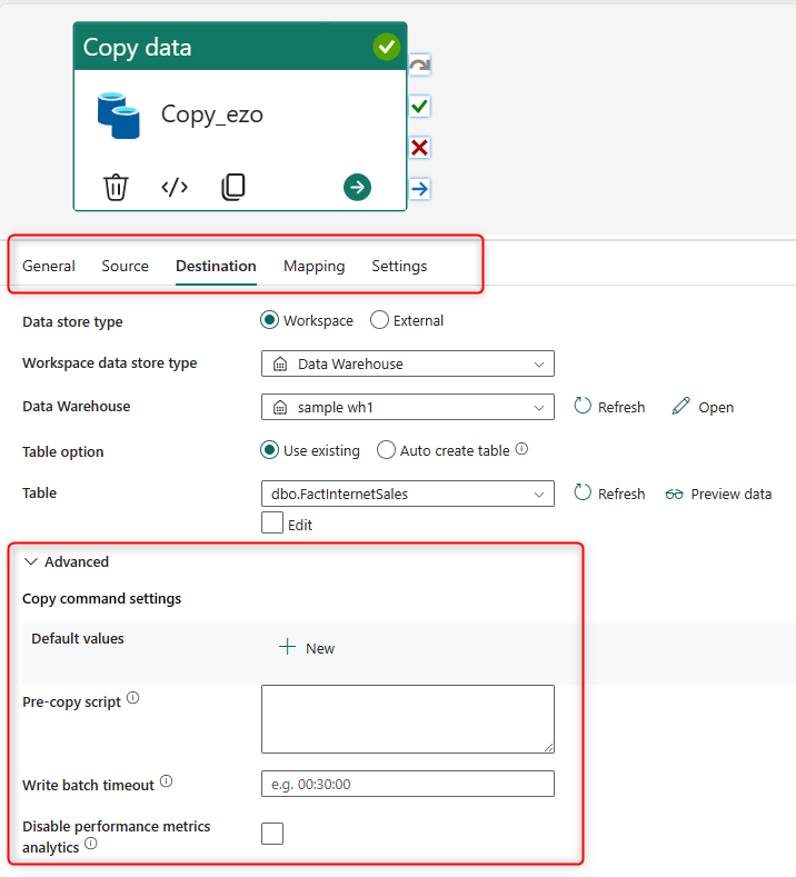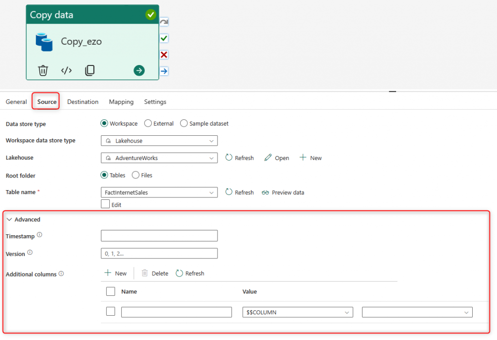 Each tab in the Copy Activity configuration will have options for advanced setup. For example, in the Destination tab, you can run a script before the copy process, Or you can create some extra columns in the Source tab, columns with timestamps and some other system information.