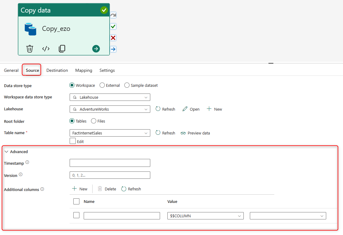 Each tab in the Copy Activity configuration will have options for advanced setup. For example, in the Destination tab, you can run a script before the copy process, Or you can create some extra columns in the Source tab, columns with timestamps and some other system information.