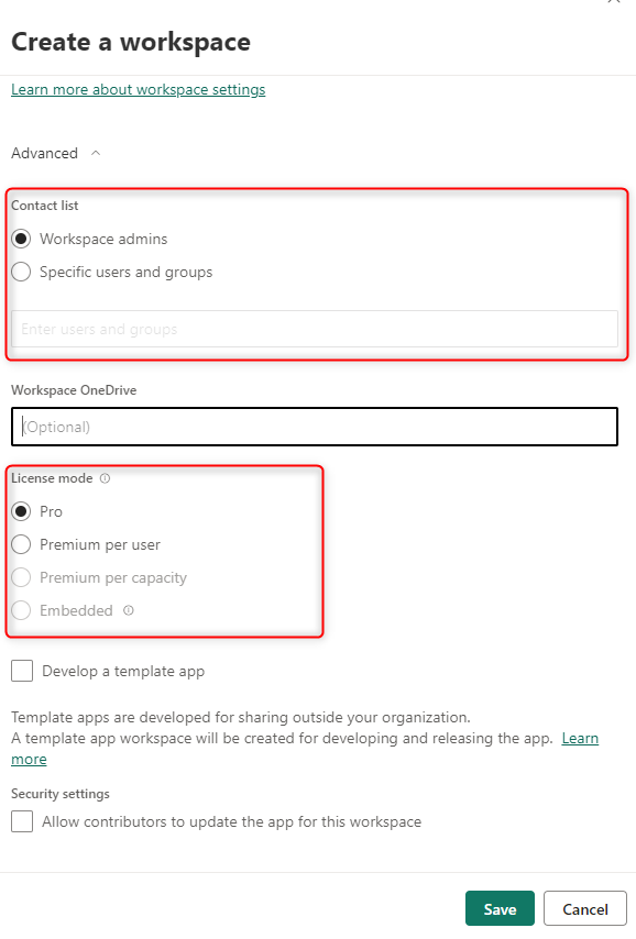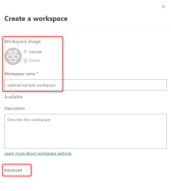 The basic settings for the workspace just include the name, the description, and the image for the workspace. You will be the workspace administrator (because you are creating it). You can use the Advanced section to go into more detailed settings for the workspace, such as capacity settings.