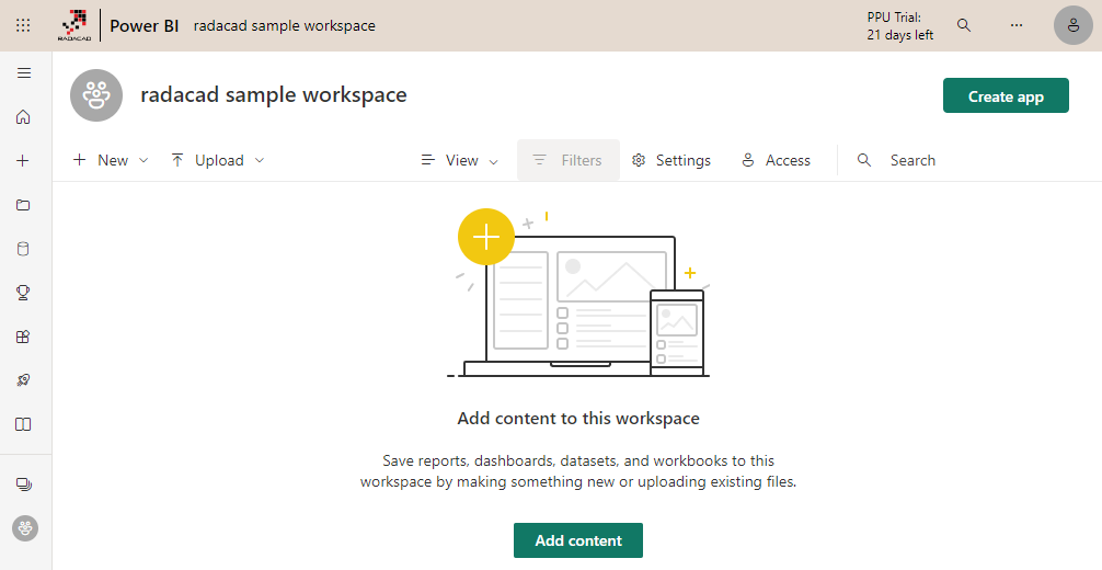 After creating the Workspace, you will be automatically navigated from “My workspace” to this new workspace. However, this workspace doesn’t have any content (dashboard, dataset, or report) yet.