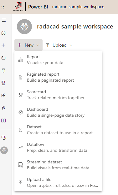 There are many Power BI objects that exist inside a workspace. Some of those can be created directly from the service, such as Report, Dataflow, Dashboard, Dataset, Streaming dataset, Datamart, and Paginated report. And some can be published through other applications, such as Power BI Desktop.