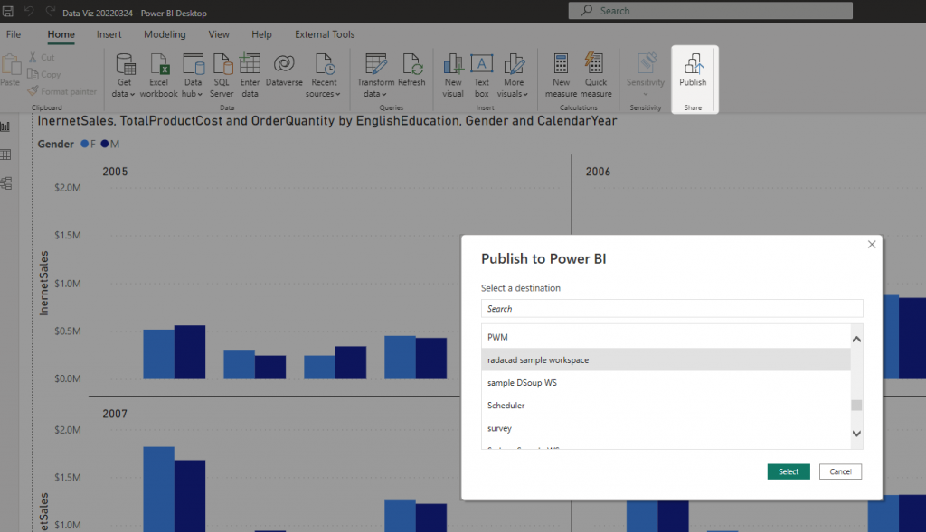 When you have a Power BI file opened in Power BI Desktop, you can click on Publish, and if you are part of a workspace, you will see a popup window asking which workspace you want to publish the report to it. You can select the “radacad sample workspace” we’ve created above.