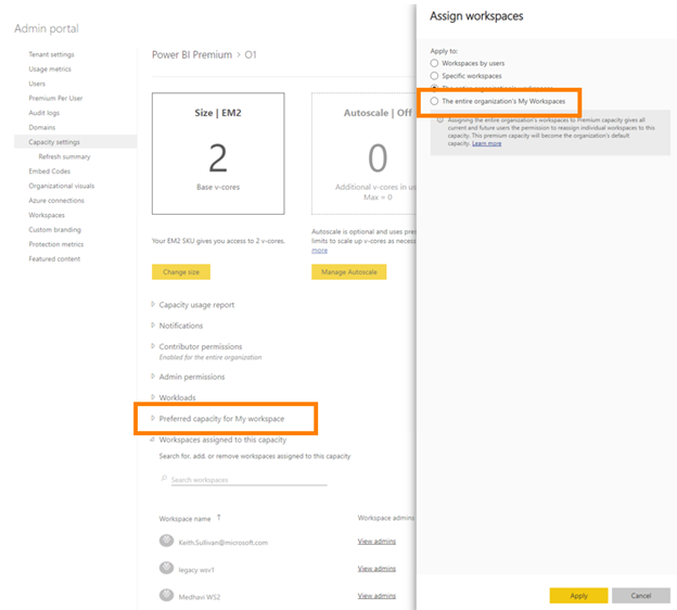Also, the administrator can control whether users can assign a personal workspace to a premium capacity. This last option also allows the tenant administrator to set a location for personal workspaces throughout the organization.