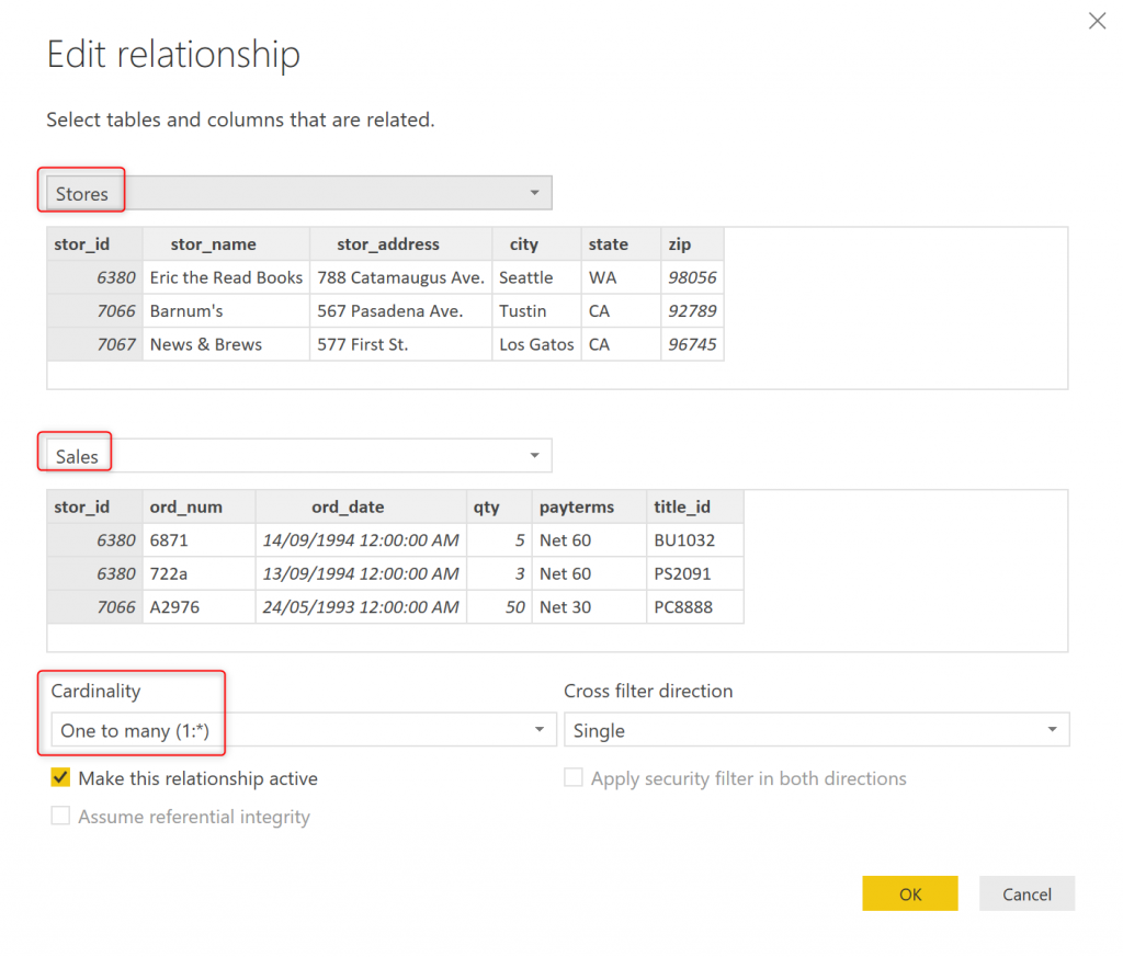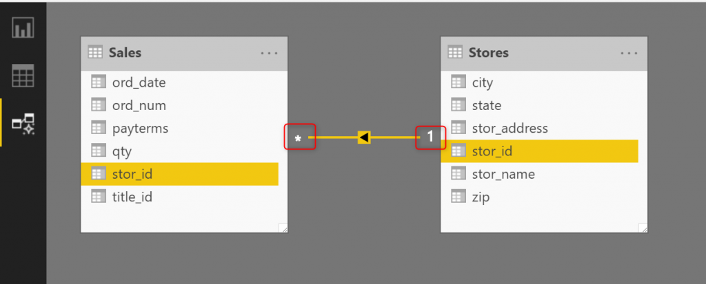 Many-to-one is a relationship commonly used between the fact table and dimension tables around it. The example above is between Sales (which is the fact table), and Stores (which is a dimension table). If we bring another table into the model: Titles (based on title_id in both tables: Sales and Titles). You can see the same many-to-one relationship pattern exists;