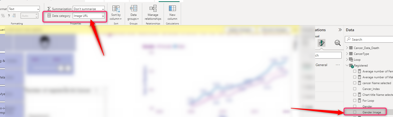 to ensure there is a need for a URL, and you already defined them in your original dataset. Also, in the report tab, check the image field; the data category is set to be Image URL as below.