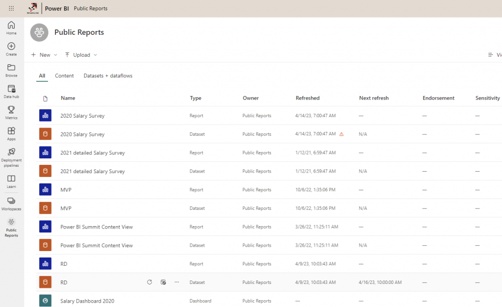 In the Power BI Service, objects are placed inside workspaces. Workspaces can have multiple Power BI objects (reports, paginated reports, dashboards, datasets, dataflows, datamarts, etc.). Workspaces are the core of deployment and sharing in the Power BI service environment. The access level can be defined on the workspace itself. And the end-users can consume the content of a workspace through Power BI Apps.