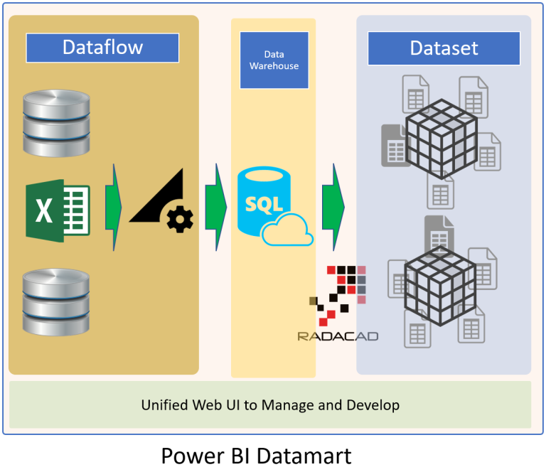 Datamarts simplifies the creation of multiple components of Power BI through one unified editor. Using a Datamart, you can have the Dataflow, a central repository of the data based on Azure SQL Database, and the Dataset through one object. Datamarts can be created through the Power BI Service. Datamarts are one of the most recent additions to the Power BI components.