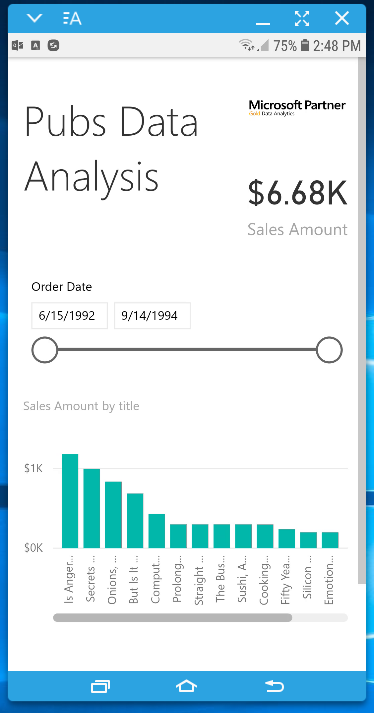 Besides using browsers to connect to Power BI service and browse reports, there is another way to access reports interactively. A Power BI mobile app is available in the Windows Store or Microsoft, the App Store of Apple, or the Google Play store. The app is free; you can easily download and install it. After logging in to the app, you can browse Power BI reports from your mobile devices. Mobile reports can be designed to be different from normal reports. The image below is a screenshot of a Power BI report opened in a mobile app;