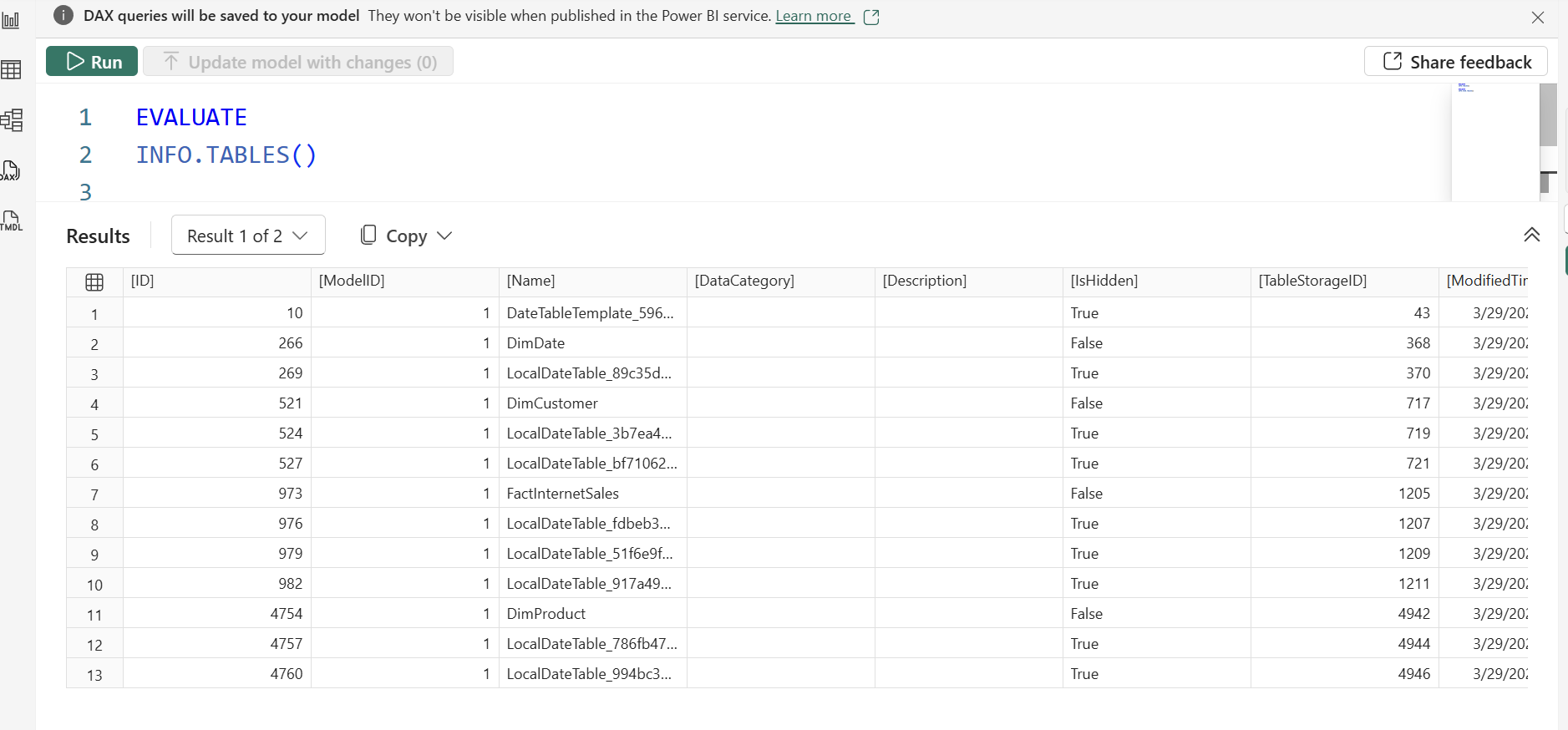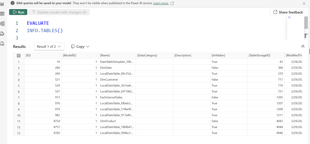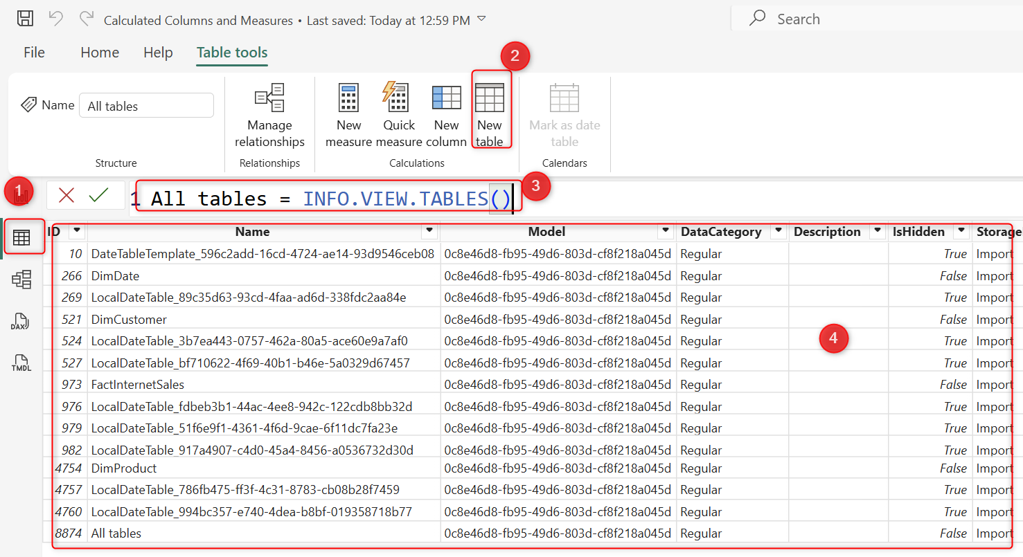 That’s it. This is how simply you can use INFO functions; they can all be used in this manner. Because they are tabular functions, you can combine them with functions such as FILTER, SELECTColumns, and other functions to generate the output in the way you want.