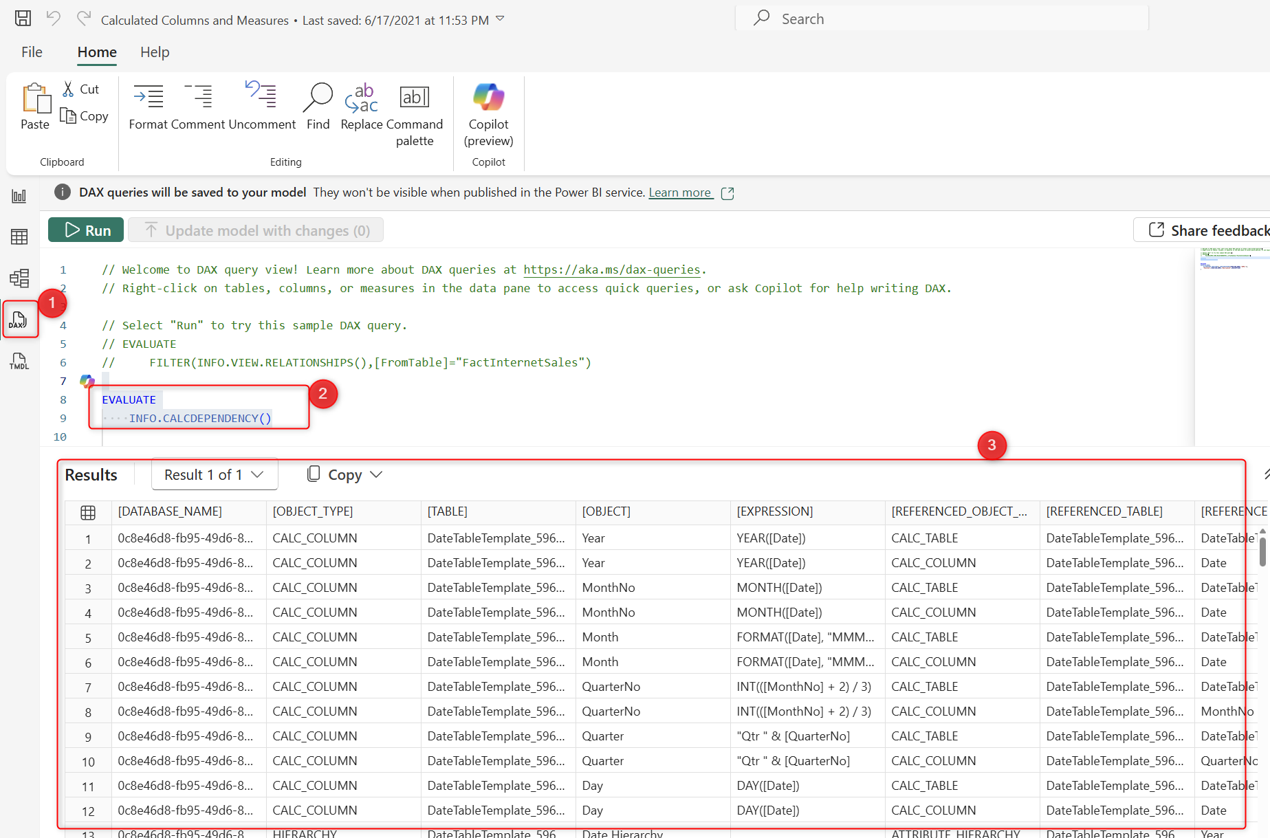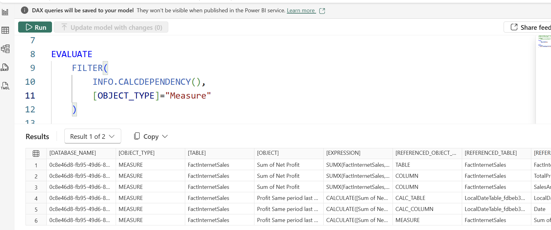 Evaluate is a function that retrieves the output of a tabular function in DAX. “Info.CalcDependency() will return all the calculations in the data model plus their dependency details.