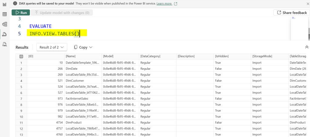 The INFO functions can be used in the DAX query view to help you build your queries. However, if you want to create reports and visualizations from it, then it is best to add it to the model as a calculated table.