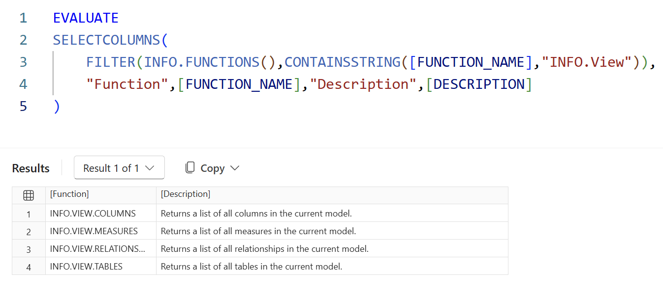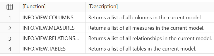There are numerous INFO functions, and they are not necessarily all new. However, a few simplified views are available for DAX functions, all of which start with INFO.VIEW, and they provide a simpler and more straightforward result set to work with.