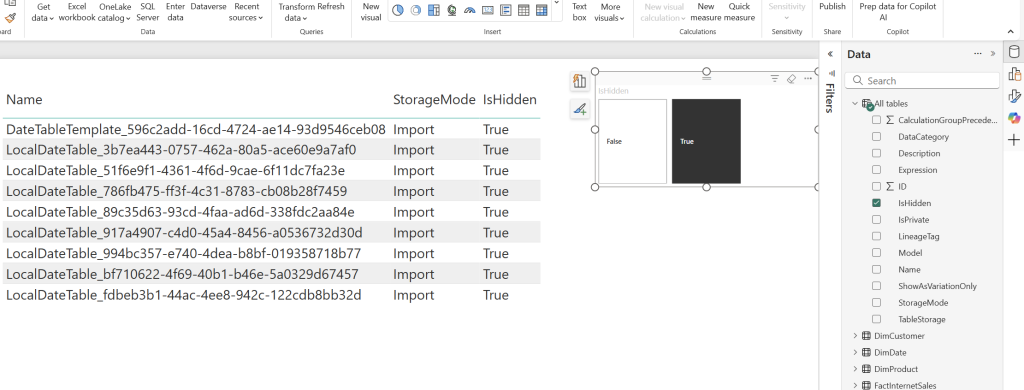 The visual above shows all the tables in the model and is filtered to show only the hidden tables.