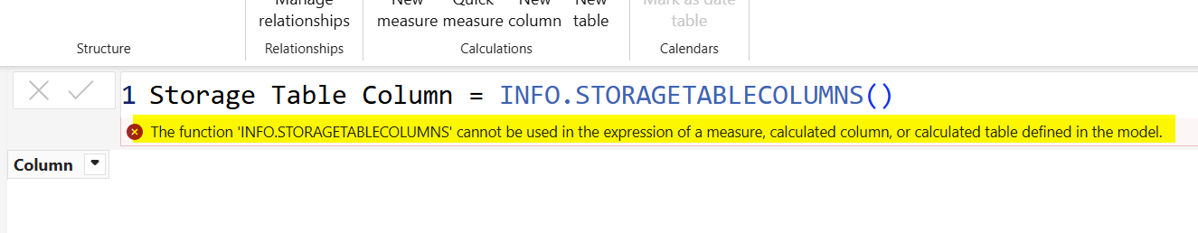 | INFO.COLUMNSTORAGES | Returns a list of all column storages in the current model with columns matching the schema rowset for column storage objects. |