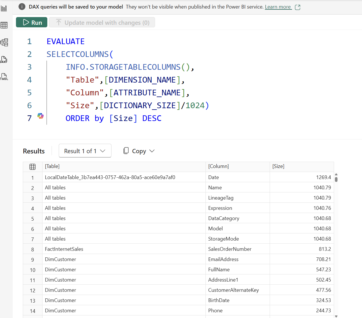 DAX INFO functions are a simple method to get metadata information about your data model. They can be used in a DAX query view as their result is in the form of a table. In this article, you saw some example usages for them and a simple way to get how much space each column consumes in the data model.