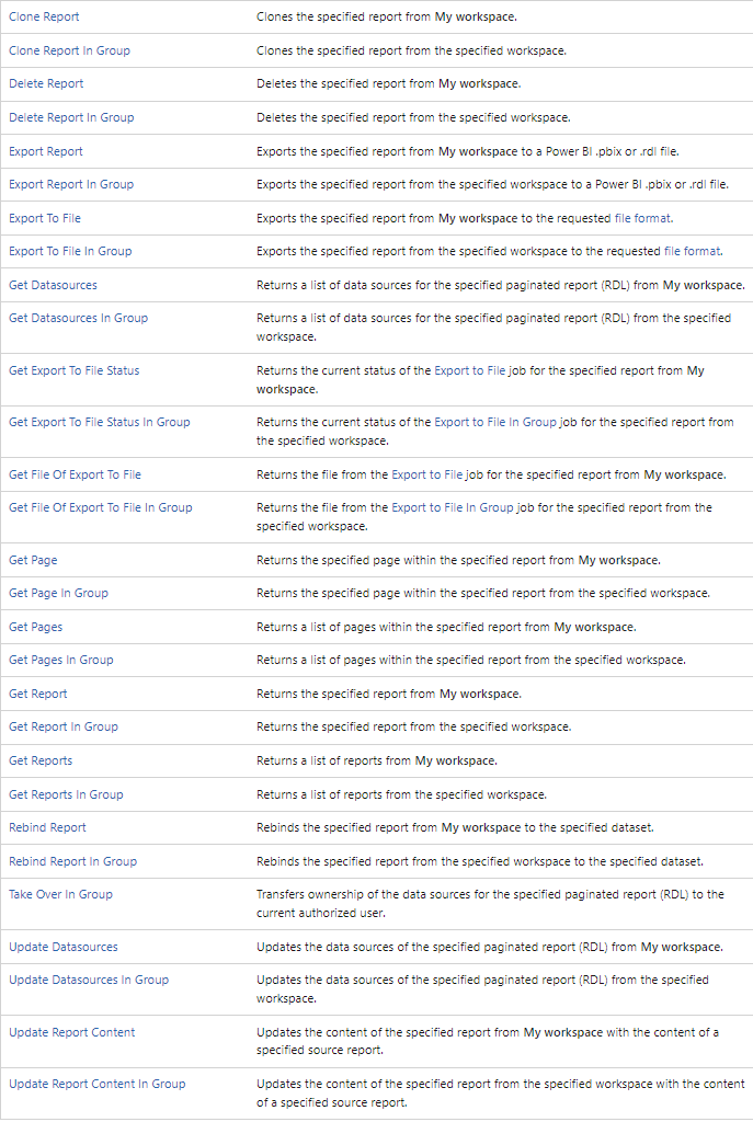 The list above is for the REST API functions for the Power BI Reports. If you compare this list with the Power BI Cmdlets for PowerShell for the reports, you can see how extensive the REST API list is. This shows you immediately that the REST API is more powerful than the PowerShell Cmdlets for Power BI (although the PowerShell Cmdlets are easier to use for non-programmers).
