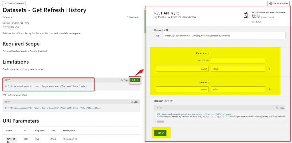 For example, if you run the Get Refresh History API for a sample dataset, you can get the response through the TRY window in the browser.