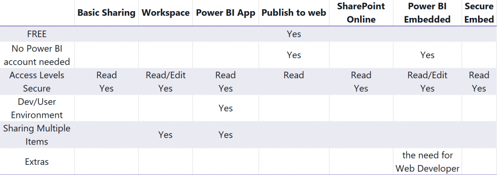 | Publish to web | The free method of sharing, which is best for public data sets where the nature of data is not confidential |