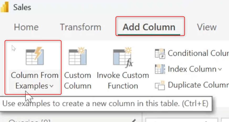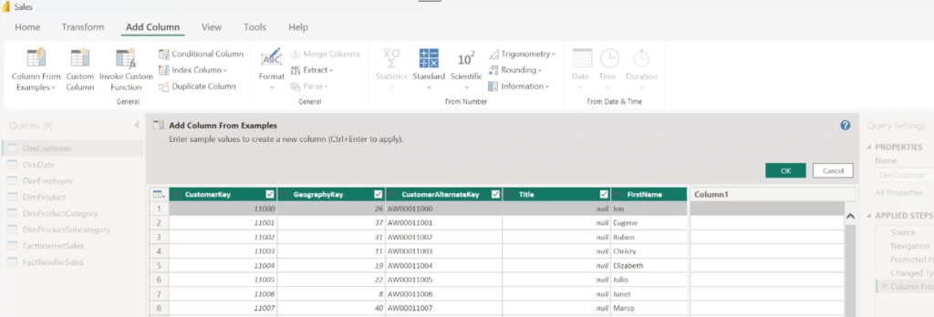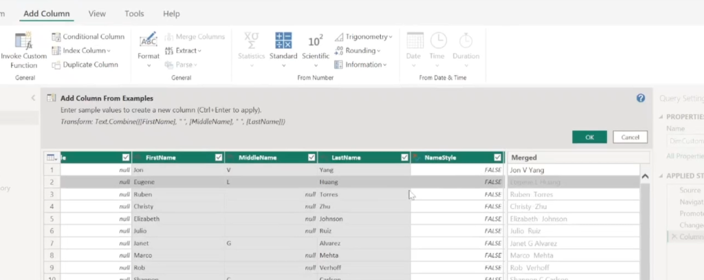 Column from Examples lets you show Power Query what you want by typing the desired result in a new column. Power Query reads your example(s), infers the logic, and writes the M formula for you. You can then accept it as a new step.