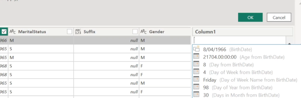 - Start typing the weekday name for the first example row or choose from the suggestions Power Query displays (you’ll see options such as Day of Week, Day of Week Name, Start of Week etc.).