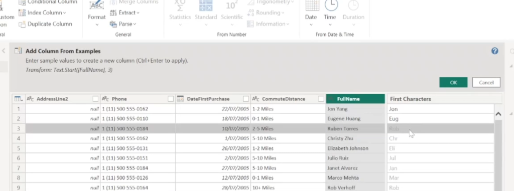 Once you know the exact transformation, you can also use ribbon actions like Add Column ► Extract ► First Characters. Column from Examples often helps you discover which built‑in to use next time.