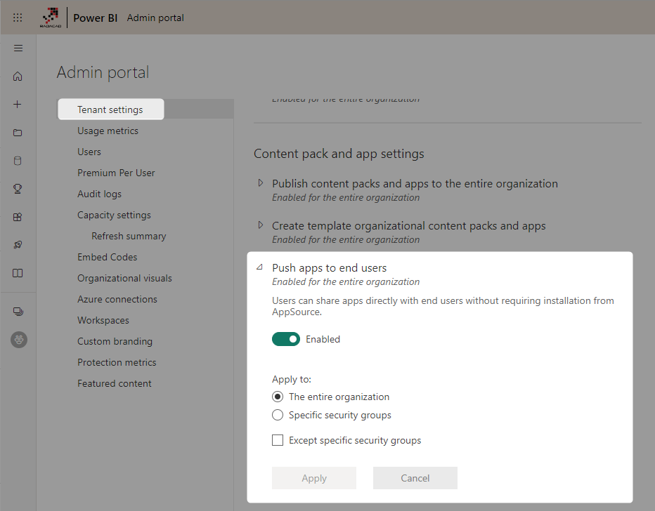 By default, the apps must be installed by the organization’s users. This is an extra step that can be done automatically (Which means that as soon as the app is created, it will be installed for the end users). The Power BI tenant administrator can enable this automatic installation of the apps under Tenant settings.