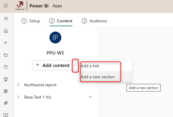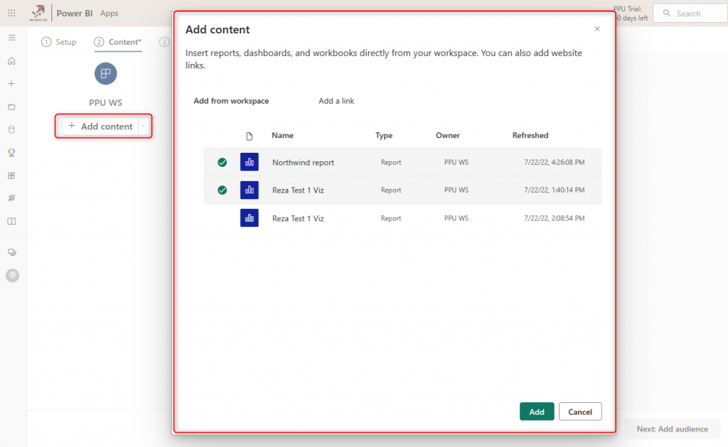In the next tab, you will set the content for the app. This can be done by clicking on Add content. If you want to share different content with different audiences, select all those content and add them here.