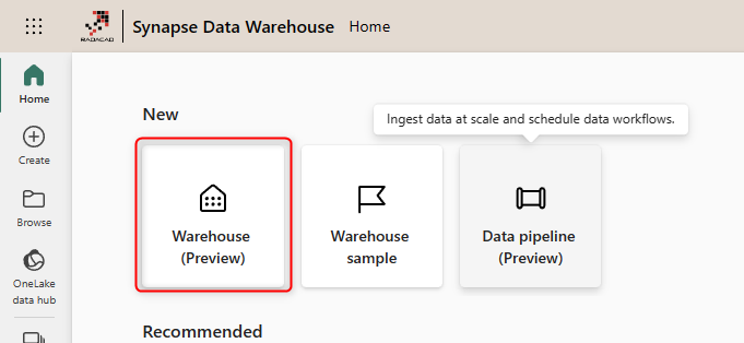 Once in the Data Warehouse workload, click on Creating a new Warehouse.